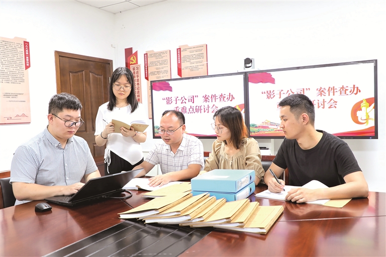 为持续深化对“影子公司”“影子股东”等新型腐败和隐性腐败的查处,浙江省开化县纪委监委建立定期研讨制度,综合运用数据比对、交流研判等方式,分析案件查办重难点问题。图为该县纪检监察干部围绕“影子公司”案件查办重难点开展分析研讨。叶梦婷 摄