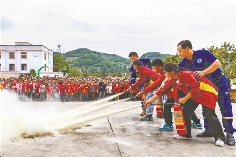 近日,各地开展形式多样的防灾减灾知识普及和应急疏散演练等活动,提高人们应急避险与安全自救能力。图为蓝天救援队队员在贵州省黔西市锦星镇第二小学指导学生使用灭火器。新华社发(范晖 摄)