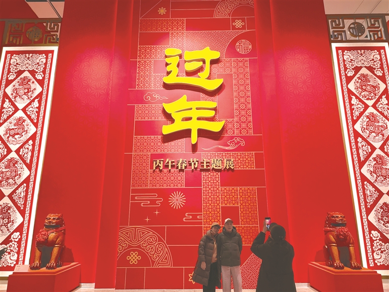 春节前夕,位于北京中轴线北延长线上的中国非物质文化遗产馆举办“过年——丙午春节主题展”。图为现场观众在拍照留念。
