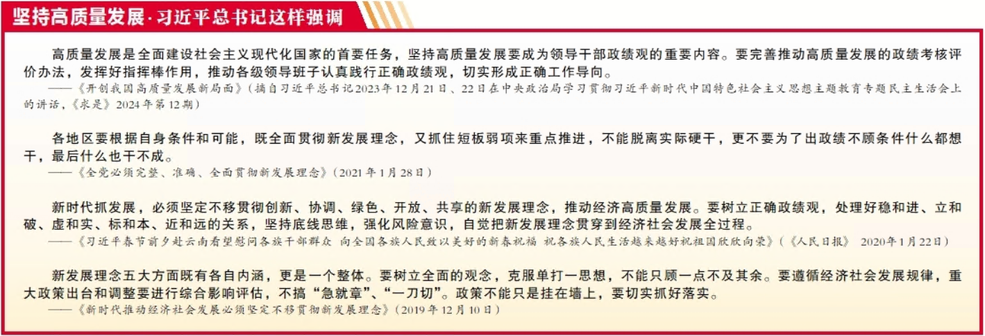发展是党执政兴国的第一要务。新时代新阶段的发展必须贯彻新发展理念,必须是高质量发展。党的二十届四中全会擘画中国未来5年发展蓝图,明确了“十五五”时期经济社会发展的主要目标,其中的首要目标就是“高质量发展取得显著成效”。