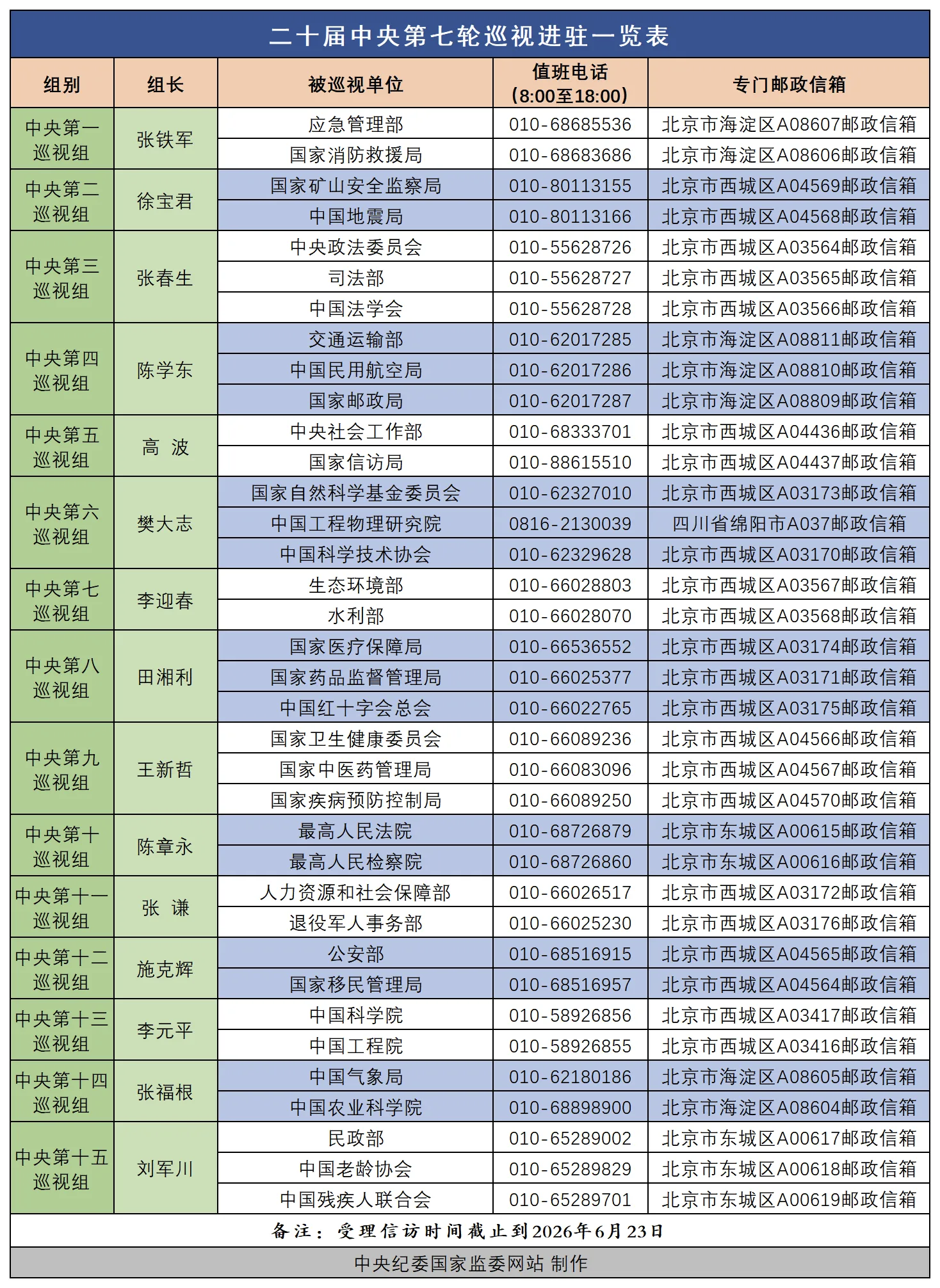 据悉,15个中央巡视组将在被巡视单位工作2个半月左右,巡视期间设立专门值班电话和邮政信箱,主要受理反映被巡视党组织领导班子及其成员、下一级党组织主要负责人问题的来信来电来访,重点是关于违反政治纪律、组织纪律、廉洁纪律、群众纪律、工作纪律、生活纪律等方面的举报和反映。巡视组受理信访时间截止到2026年6月23日。(中央纪委国家监委网站 吕佳蓉)