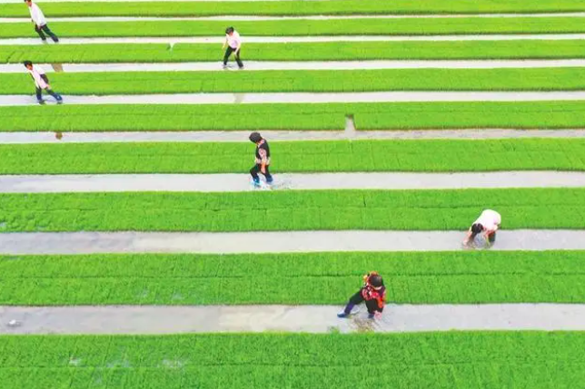 芒种时节,各地农民抢抓农时忙着犁田、插秧、施肥。 图为江苏省南通市如皋市东陈镇蒋宗村,村民正在进行水稻秧苗的田间管护。