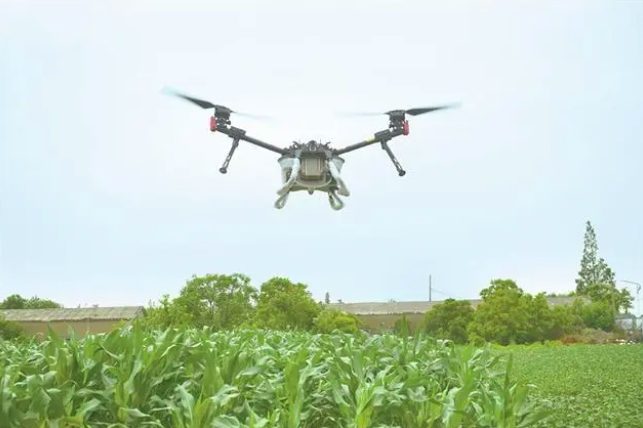 图为湖北省孝感市云梦县鑫盛蔬菜种植专业合作社组织农业植保无人机升空,对玉米地病虫害进行防治并喷洒营养液叶面肥。 (图片来源:视觉中国)