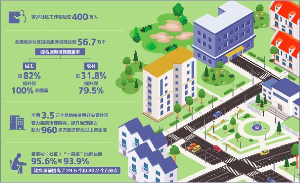 西湖区的实践,是十年来我国城乡社区治理服务水平持续提升的一个缩影。目前,全国城乡社区综合服务设施达到56.7万个,城市社区综合服务设施覆盖率由82%提升到100%全覆盖、农村覆盖率由31.8%提升到79.5%,分别增长18个、47.7个百分点。为民便民安民功能不断增强,抽样调查群众满意度达到87.6%。